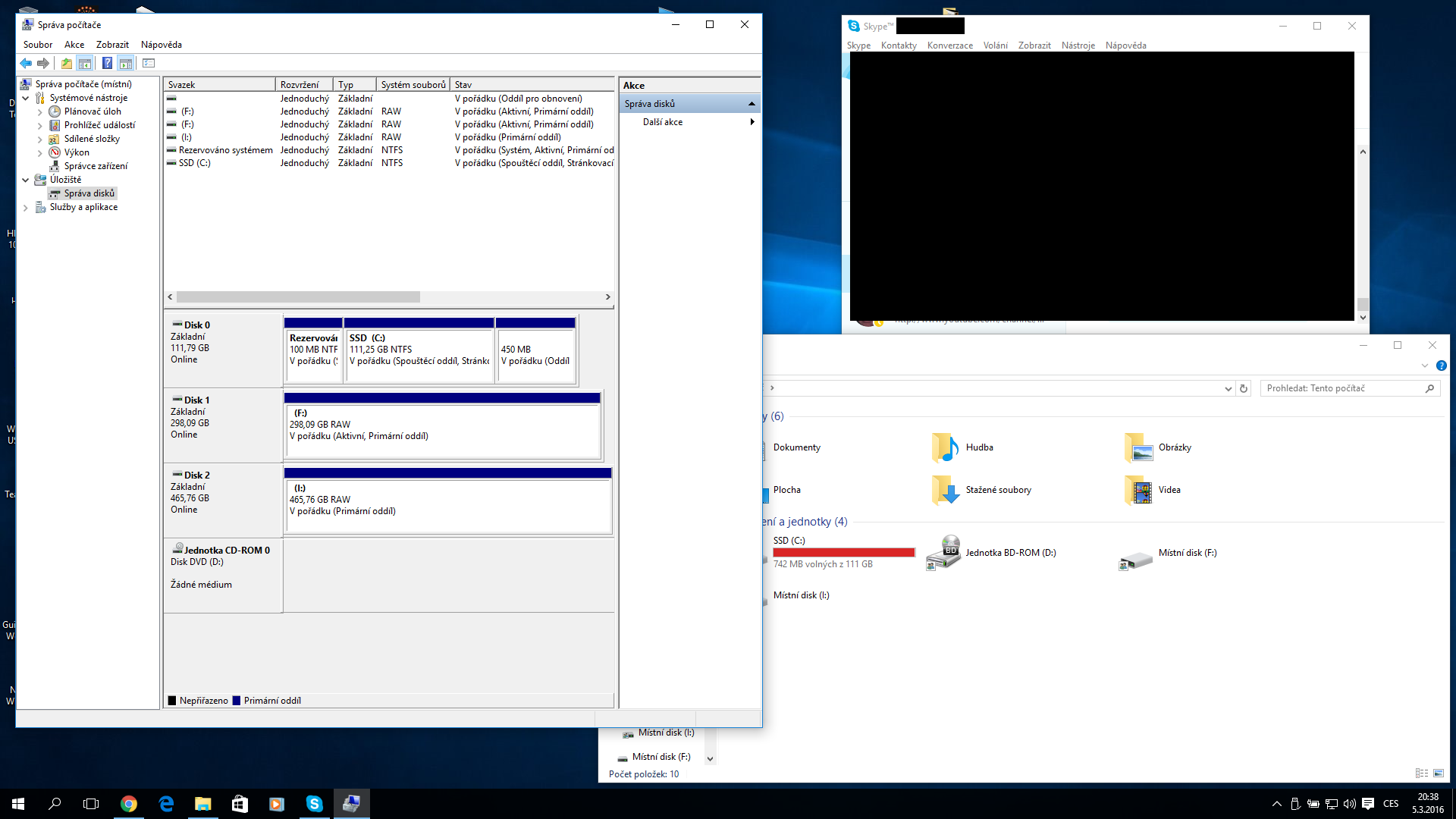 Zhruba před měsícem se mi toto stalo poprvé, ale jen u jednoho disku (Westernu). Večer jsem normálně vypnul počítač, druhý den odpoledne zapnul a disk už nenačetl. Včera se mi to stalo podruhé, tentokrát oba disky a oba najednou. Jak před měsícem, tak i včera jsem problém vyřešil přes chkdsk. Ten opravil nějaká vadná místa (tomu moc nerozumím) a disky zase běžely. Problém je ale v tom, že do každé složky musím získat oprávnění. Podobně jako když vytáhnete z jednoho počítače systémový disk, připojíte ho do druhého počítače a chcete se dostat do složky users. Kromě toho mi každých +-15 minut vyskočí chybová hláška, že koš na jednotce I (mediální disk) je poškozený a jestli ho chci vysypat. Tam ať kliknu ano nebo ne, je to jedno. Chyba vyskočí znova. Tam bych to možná připisoval i vadnému sektoru. Taky jsem zpozoroval ve správě počítače, že programový disk F se zobrazuje v seznamu 2x a jeden z nich je právě ve formátu RAW. Přikládám i screen pořízený v době selhání obou disků.
