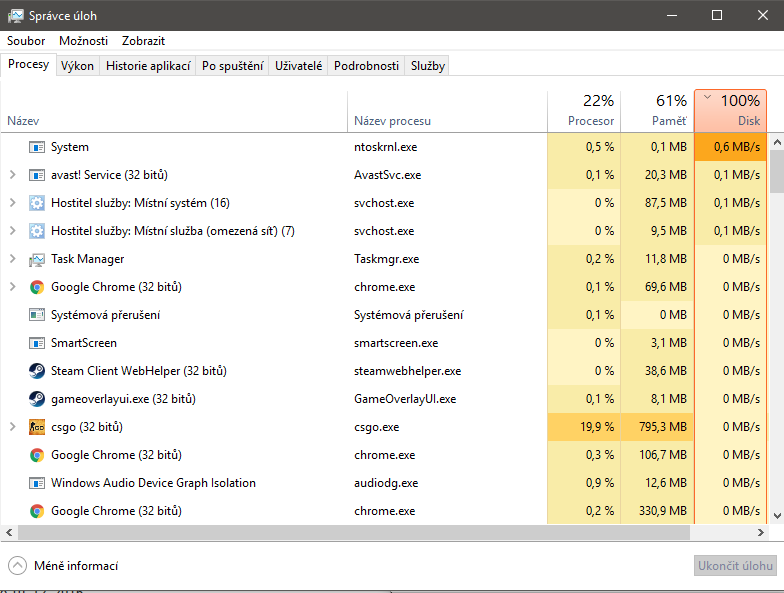 Zdravim, když si otevřu správce úloh tak to na mě řve, že mám vytížený disk na 100%, přitom žádné aplikace navíc než normálně spuštěné nemám. PC jsem projel antivirem a taky nic. Zkoušel jsem ještě program CrystalDisk a program píše, že je disk v pořádku. Zkoušel jsem restart a taky nic. Nevíte, kde by mohl být problém?