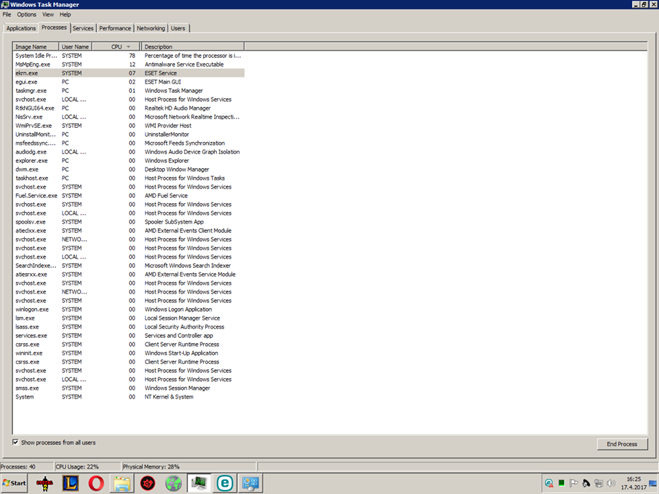 V prvořadě ve správci úloh zapni procesy všech uživatelů, pak ti to zobrazí i systémové ulohy a můžeme řešit dál...