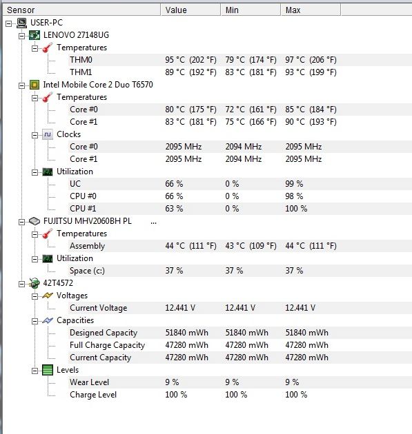 Podle oznaceni je to Thinkpad R500 s T6570 a integrovanou grafikou. Pokud je ten test na stole a pri pokojove teplote +- 20 stupnu, tak je tech 90 stupnu podle me dost.