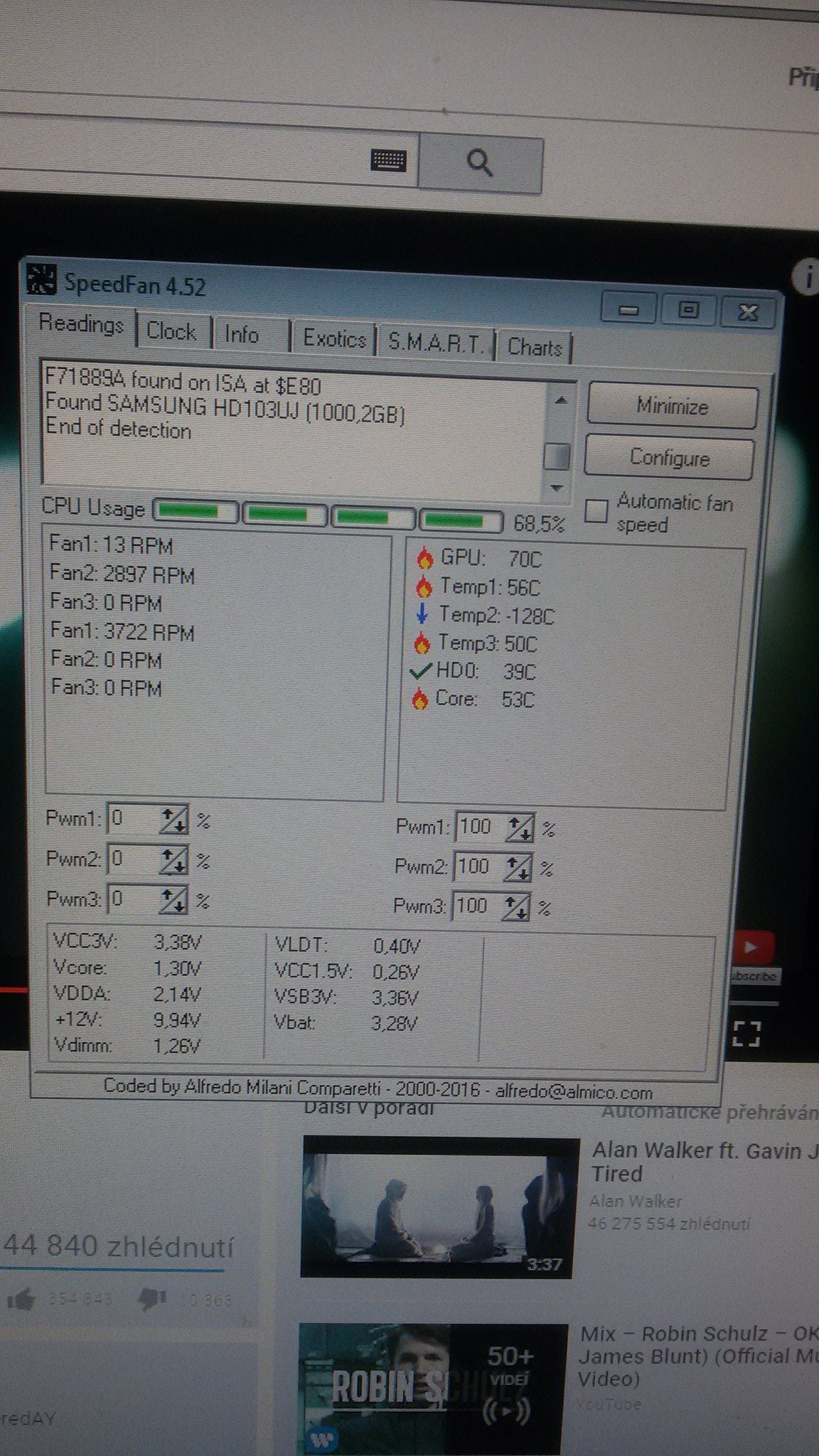 Vše klapalo dobře hrál sem a cca za 30 minut se mi sekl obraz, zvuk, kurzor prostě vše. Zkusil sem přeinstalovat W7 to také nepomohlo tak sem vyčistil PC myslel sem si že to je přehřejváním. Po vyčištění sem to zapl a hrál sem cca 2 a pul hodiny a najednou to samé sekl se obraz a nic nešlo. udělal sem test pamětí ram a ty jsou v pořádku. hlídal sem i teploty při hraní a ty se mi zdají normální viz foto. A když sem tam dal zpátky moje staré paměti ram tak to běha v pořádku 1x4gb . Foto teplot je při seknutém obraze a Memtest sem nechal běžet dal 12 hodin a 30minut bez erroru. zkusil sem také dát 2 stejné paměti zvlášť a ani to nefunguje