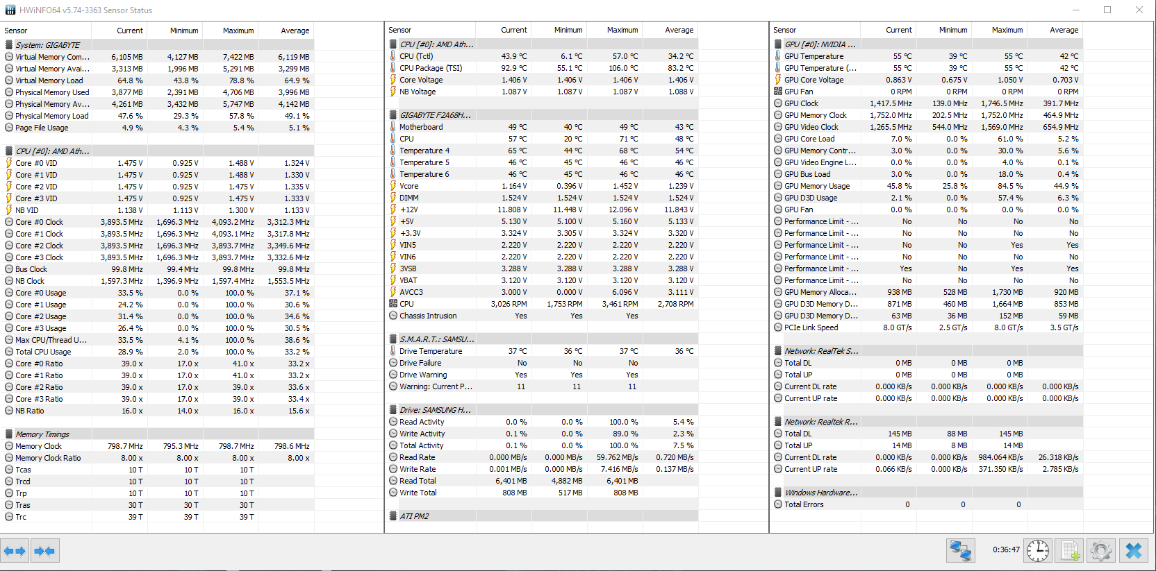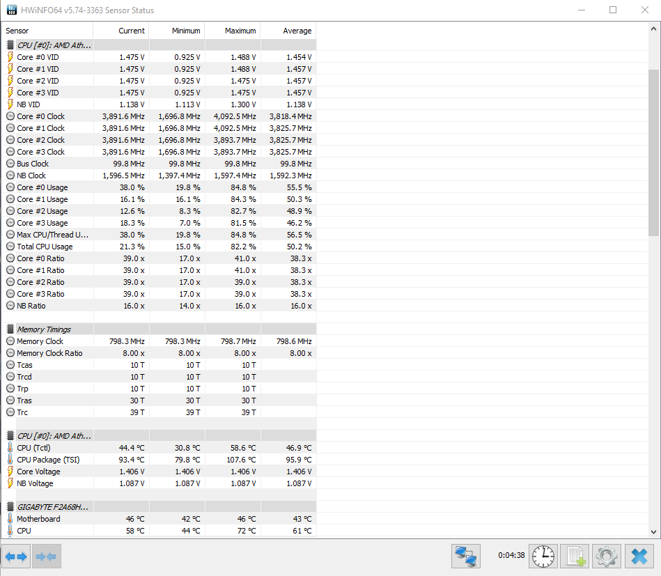 Turion píše:Ok, tak napětí asi bude správně, ale je nesmysl ta teplota. Nejspíš používáš softvér, který nesprávně čte senzor. Nenapsal jsi kde tu teplotu vidíš. Takže se podívej přímo do biosu, kde je nějaká záložka jako monitoring a napiš kolik to ukazuje tam na CPU napětí i teplotu. Pak můžeš použít program HWiNFO, kde zaškrtneš senzory a dáš sem screen rokliknutej na dva šipkama dole, aby bylo vidět víc údajů. Zapni ten HWiNFO na pozadí, zapni hru a za pár minut nebo déle, pak hru vypni a udělej screen z toho programu a dej ho sem jako přílohu.