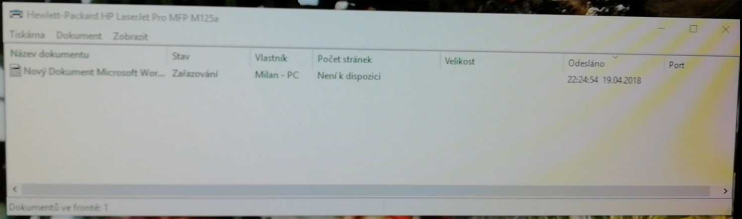 Mám nainstalovanou tiskárnu Hewlett-Packard LaserJet MFP 125a. Po spuštění tisku jakéhokoli dokumentu mi proběhne tisk, ale nic se mi nevytiskne. V Tiskové frontě mi to naskočí a potom to zmizne viz foto.