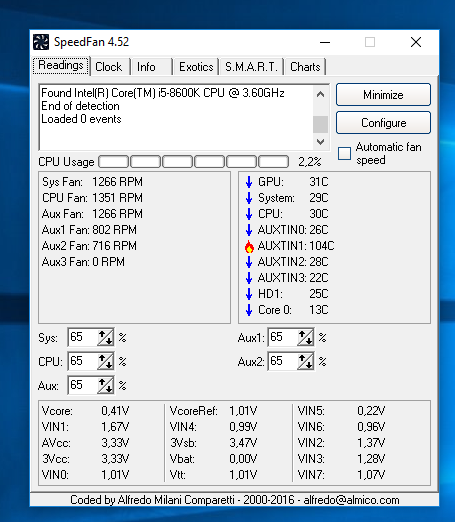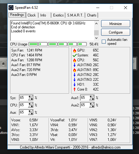 Přijde mi, že PC docela dost topí. Tak jsem stáhl SpeedFan a zkusil to bez zátěže ( to je asi ok ) a se zátěží.