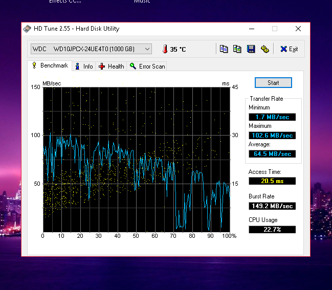 Tak bych to tipnul na disk podle benchmarku. Access time naprd plus velké propady rychlosti.