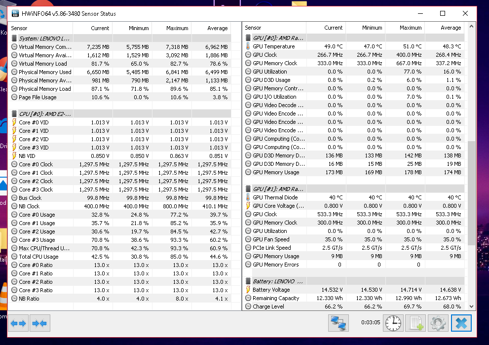 HWiNFO - screen senzorů běžících nějakou dobu na pozadí při zatížení hrou nebo benchmarkem.