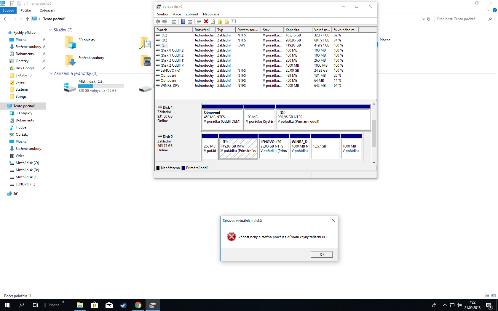Tak já, žádný flashdisk k tomu neměl. Dal jsem ho do svého PC tam se mě sice ukáže lenovo disk a ještě jeden bez označení, ale nemohu se na ně dostat a v CDI se neukáže vůbec. Zkouším mrknout do správy disku a i ta se mě načítá 10 min. Než se mě PC dostal do windowsu tak to trvalo 5 minut.