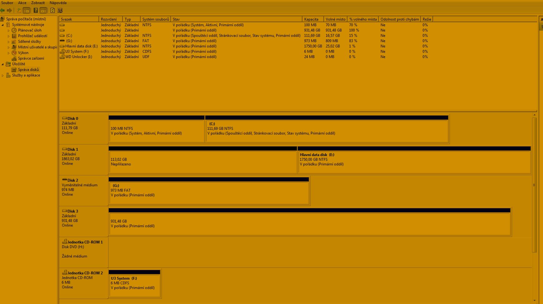Pokud je pripojen USB, dej screen ze Spravy disku, pokud LAN, pak SMART z weboveho rozhrani.