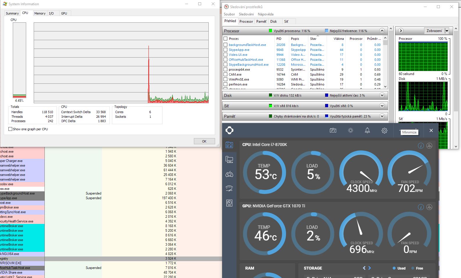 Vsiml jsem si, ze spravce uloh mi ukazuje vytizeni procesoru na 100% a dalsi dva programy a to CAM a Process Explorer ukazuje jen nekolik malo procent. Za dalsi procesor je taktovan na 3.7 MHz a permanente mi procesor na CAMu ukazuje ze jede na 4.3 MHz. Nejak sem z toho blazen. Prikladam dva screeny s programama.