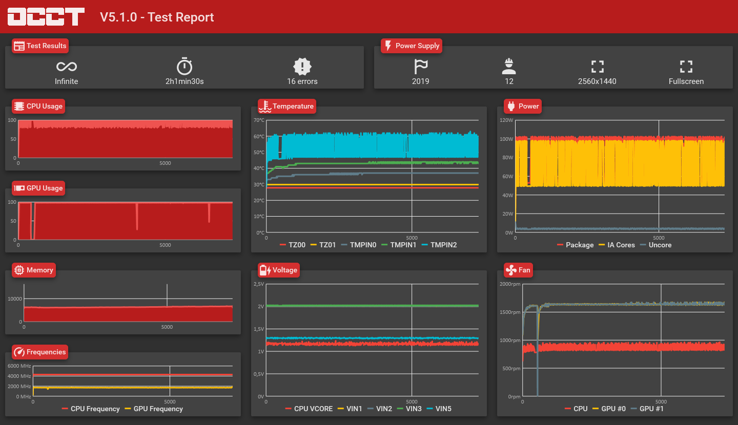 Zdravim , vím že už se to tu řešilo mnohokrát , ale každa hra mi po chvili spadne . Nejdřív to bylo jednou za den a postupne se to stupnovalo ted uz to spadne po kazdem spusteni, vratí se do windows bez žádne chybově hlašky -jakoby nic (někdy se sekne úplně) . Teploty mě nepřijdou vysoké max 50-60stupnu zkoušel jsem memtest ten napsal vše ok , grafika ve win taky nevykazuje zadny problem tak jsem zkoušel OCCT 5.1.0 je tam test na zdroj a ten mi našel 16chyb ,ale vic mi toho neřekl, nevím jaké chyby to jsou a graf v kterym se nevyznam , nemohl by mi nekdo pomoci co ten graf znamená ? dá se z toho propadu něco vyčíst ?. zdroj seasonioc 600w , Gk -rtx2070 ,i7 8700k