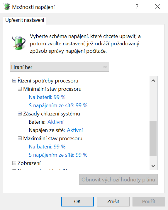 Vím že si zminoval, že schém,a napájení máš nastavené na výkon, ale koukl bych, jestli se tam něco přímo nezměni po zapojení kabelu. Tzn ty to máš nějak nastavené, ovšem interně je nastavené: "jakmile dojde k připojení kabelu, nastav tohle a tohle na takové a takové hodnoty" a to tam přímo už nemusíš vidět. Podívat se hloub jestli tam přímo není něco co souvisí s napojením kabelu, něco co se dá on/off, enable/disable. Koukni do menu jako na obrázku a všechno si to projed, jak to máš nastavené.