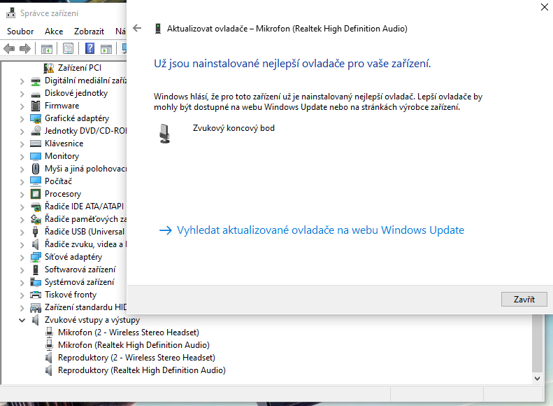 Spravil si aj reštart po aktualizácií ovládača?Vyskočí okno po pripojení mikrofónu?Skús odinštalovať mikrofóny a sprav reštart.Potom pripoj mikrofón.