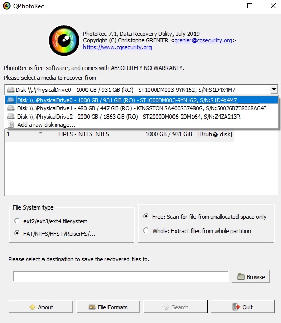 Po otevření staženého programu si ho rozklikneš,rozbalí se třeba ve WinRARu a ze složky klikneš na qphotorec_win ,za chvilku se ti otevře okno s programem,kde zvolíš který disk chceš opravit . Viz. níže na obrázku :