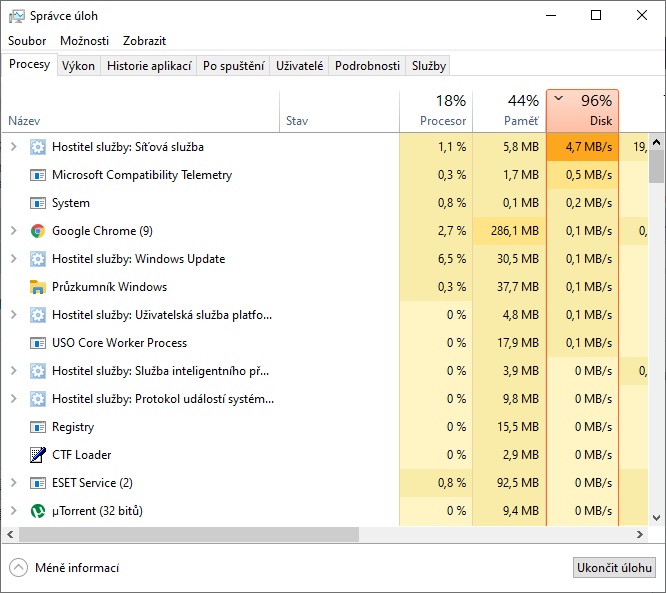mám menší problém, PC mi stále píše výkon disku 100% nebo alespoň 95%, i když v procesech zrovna není nic, co by ho nějak zatěžovalo. Je úplně jedno, jestli běží aktualizace war thunder 60 BM/s nebo jen nějaký proces na pozadí, co bere jen 0,5 MB/s, výkon disku je pořád 100%. Nejčastěji se nahoře ukazují nějaké procesy přímo od Windowsu nebo hostitelé služby, jako na screenu