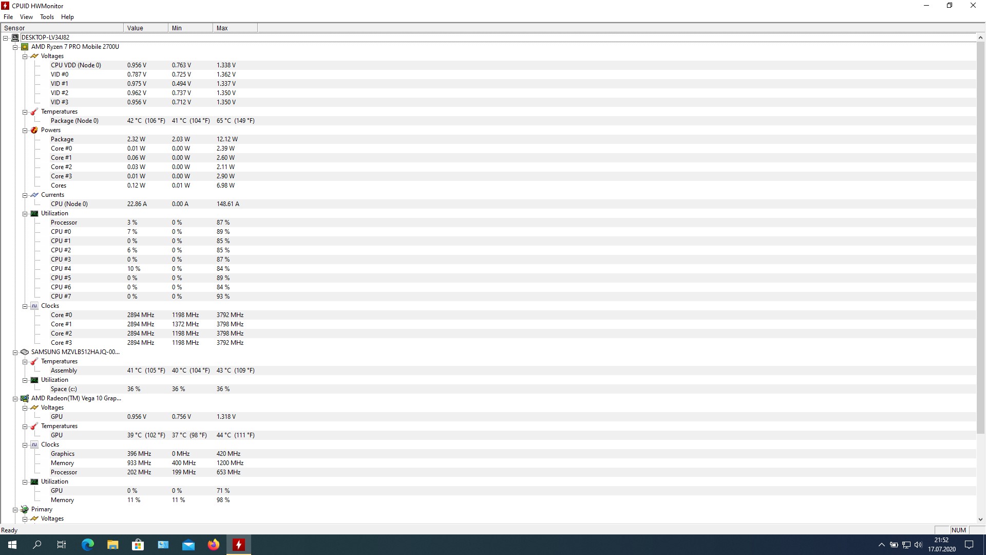 Mam tento notebook HP ProBook 455 G6 s 16GB RAM a 512GB SSD s 4 jádrovým procesorem AMD Ryzen 7 Pro 2700U,který má základní takt 2,2GHz a s režimem turbo má 3,8GHz. Je v něm integrovana grafika vega 10.