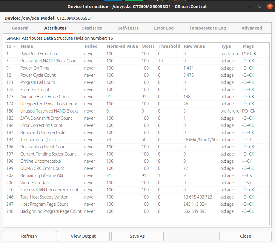 ID# ATTRIBUTE_NAME FLAGS VALUE WORST THRESH FAIL RAW_VALUE