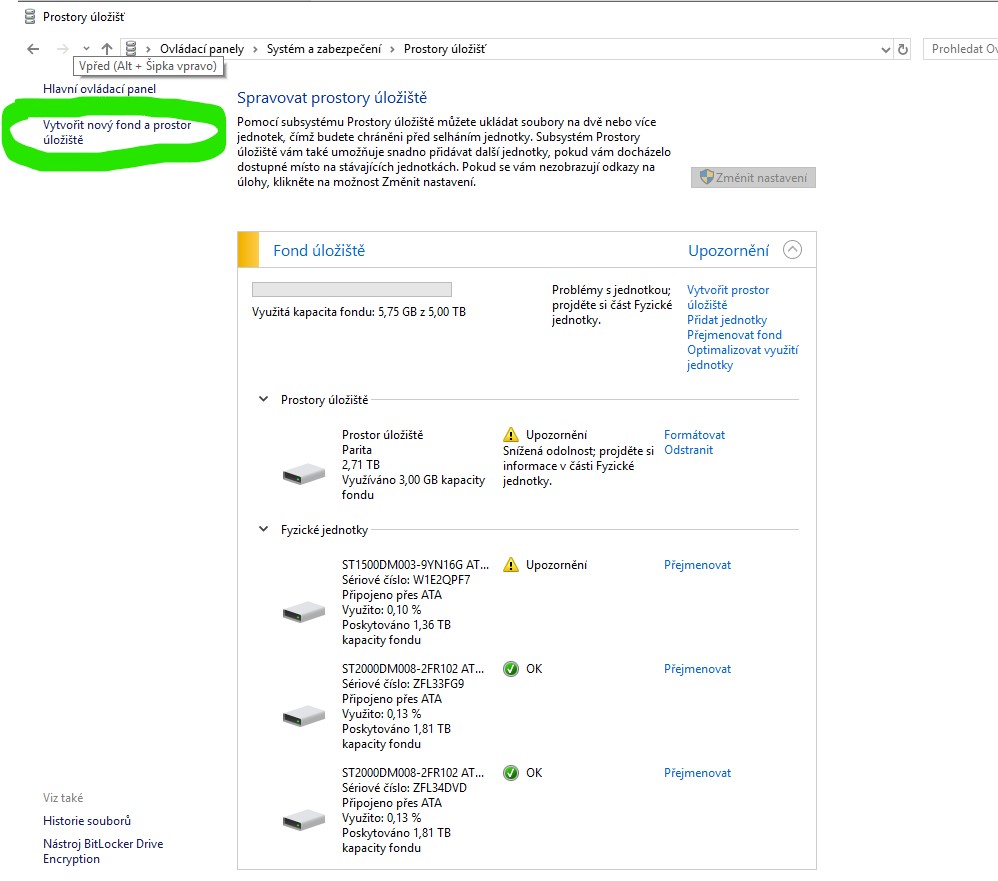 povypínej ty "lahůdky" jako "inteligentní úložiště" a kdo ví, co jsi kde zapnul a instaloval ... pak se ti bude všechno zobrazovat jako běžnému uživateli ... taky ten "pseudo raid" co se snažíš vytvořit ... odebrat jednotky jednu po druhé, dokud nejsou plné dat ...