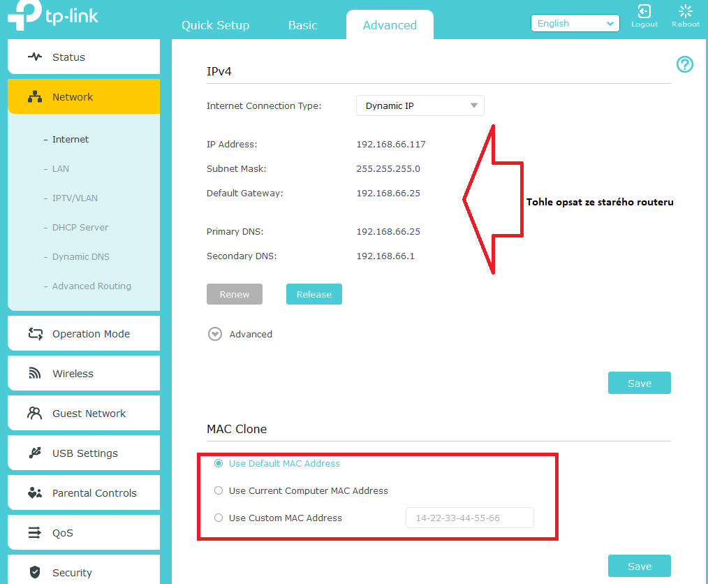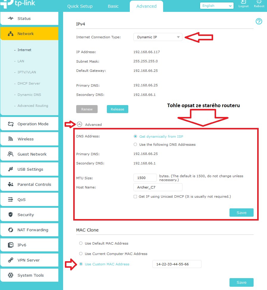 MAC adresu přepnout na Use Custom MAC a opsat ze starého routeru.