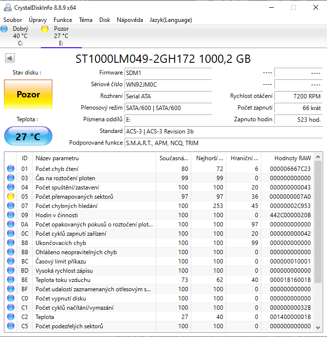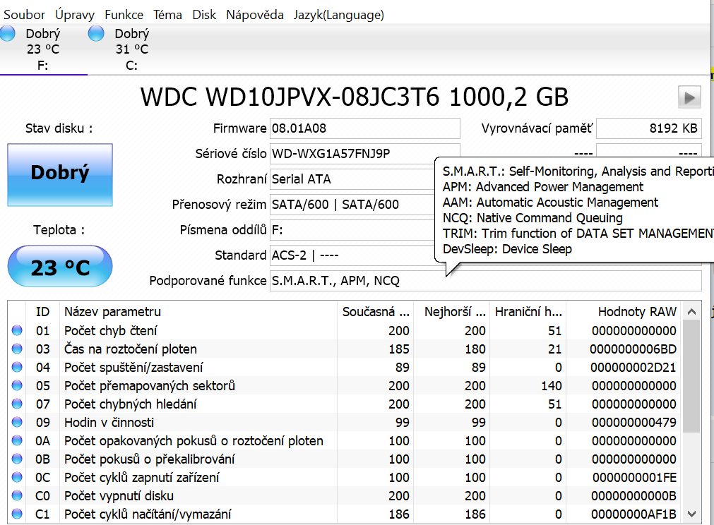 Děkuji moc za odpověď. Ještě by mne zajímala další věc - v jiném PC - notebooku - mně Crystal Disc Info ukazuje také u 1TB HDD stav "dobrý" a přitom počet přemapovaných sektorů je 200/200/140 a počet chyb čtení 200/200/51. Znamená to, že HDD také odchází? Nebo je to normální?