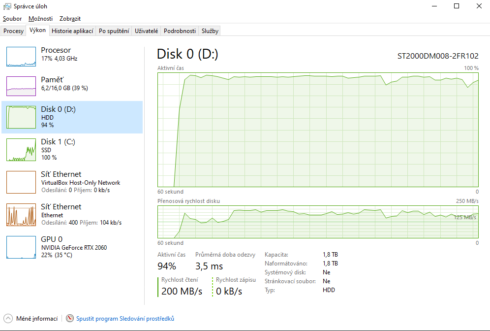 Není vyloženě nic co by ho vytěžovalo konstantně na 100%. Dám příklad. Hraju Star Wars Jedi Fallen Order, hra běží v pohodě bez záseku třeba minutu - dvě, využití disku je max. na 5%, poté na sekundu vyletí využití na 100%, dropnou fps. Ale stane se, že využití je na chvilku třeba 15% a hra se začne sekat. Paradoxně využití disku teď lítá často při cutscenách ve hře, kdy během pár sekund je mezi 0 - 60% např. neustále nahoru a dolů. Teď jsem třeba přesouval hry na steamu z disku C (ssd) na D (hdd) a naopak. Na obrázcích jde vidět jak se to chovalo.