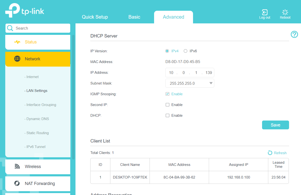 Přes prohlížeč se zaloguju, vypínám DHCP a měním IP. Zkoušel jsem podle různých metod následující: