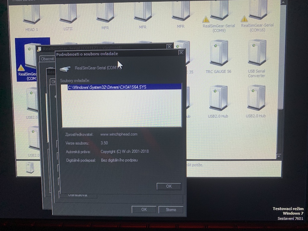 aktuálně řeším problém s podepisováním driveru ve Windows 7 (64x). Mám ovladač, ale po instalaci vyskakuje ve správci zařízení chyba 52, která odkazuje na chybějící nebo vadný podpis. Driver by dle výrobce měl být podepsaný a mám ho k dispozici, ale ani při manuální instalaci chyba nezmizí. Jedná se o driver k poměrně specifickému hardwaru (RealSimGear G1000) a nainstalovaný driver je přímo pro W7 s přídomkem signed. Zkoušel jsem reinstalaci pomocí dodaného SW, manuální instalaci driveru i manuální přiřazení COM Portu, ale nic nepomohlo. Jediné co fungovalo bylo spustit pomocí F8 a možností Disable Driver Signature Enforcement. Ale toto řešení není permanentní, po restartu opět HW nefunguje.