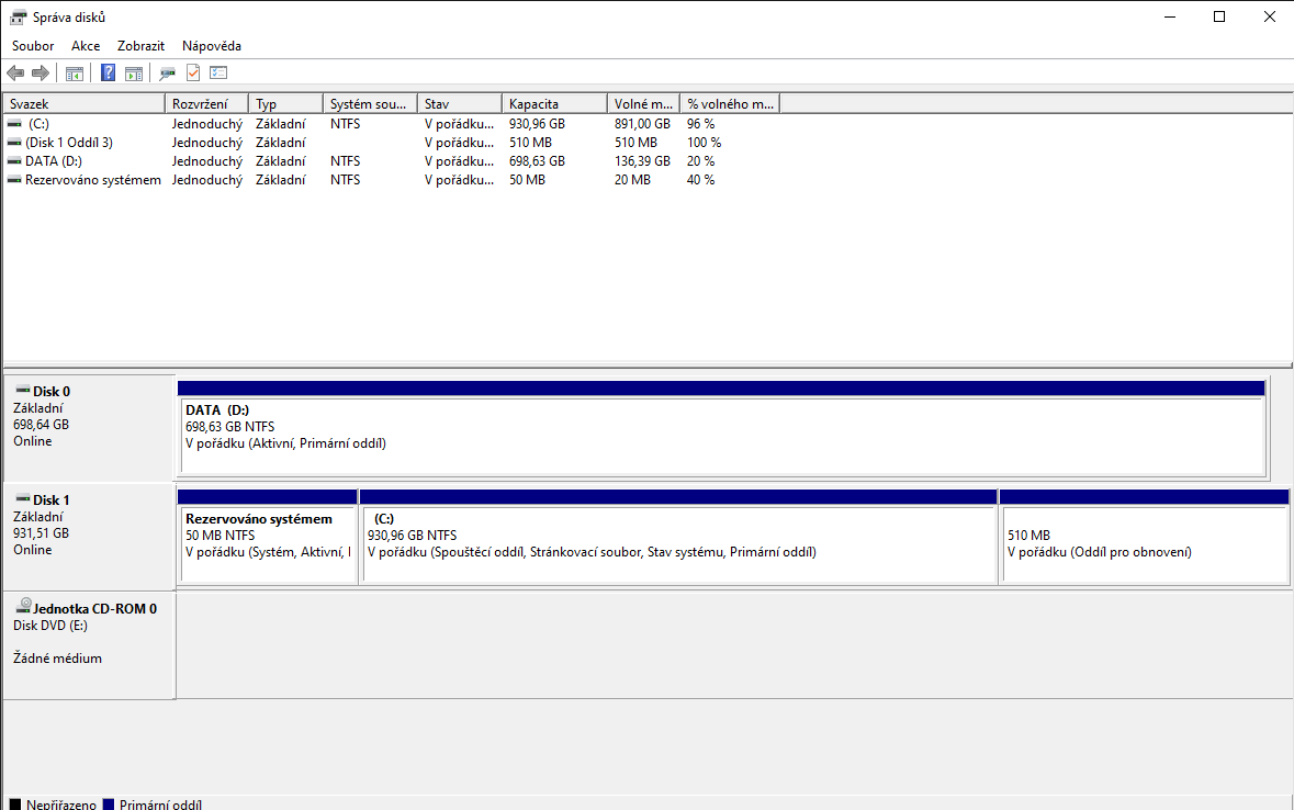 Do přílohy jsem dal fotku, ze správce disků. Stařeček je ten DISK 0 ale skrytý oddíl jsem tam nenašel?