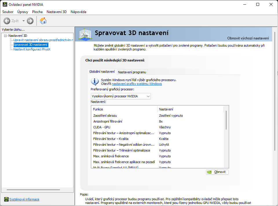 Pak screenshoty 3D nastavení v Nvidia panelu.