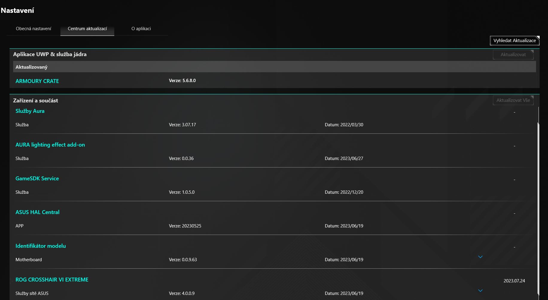 Je aktualizovaný LED FW, Aura Service v Armoury Crate?