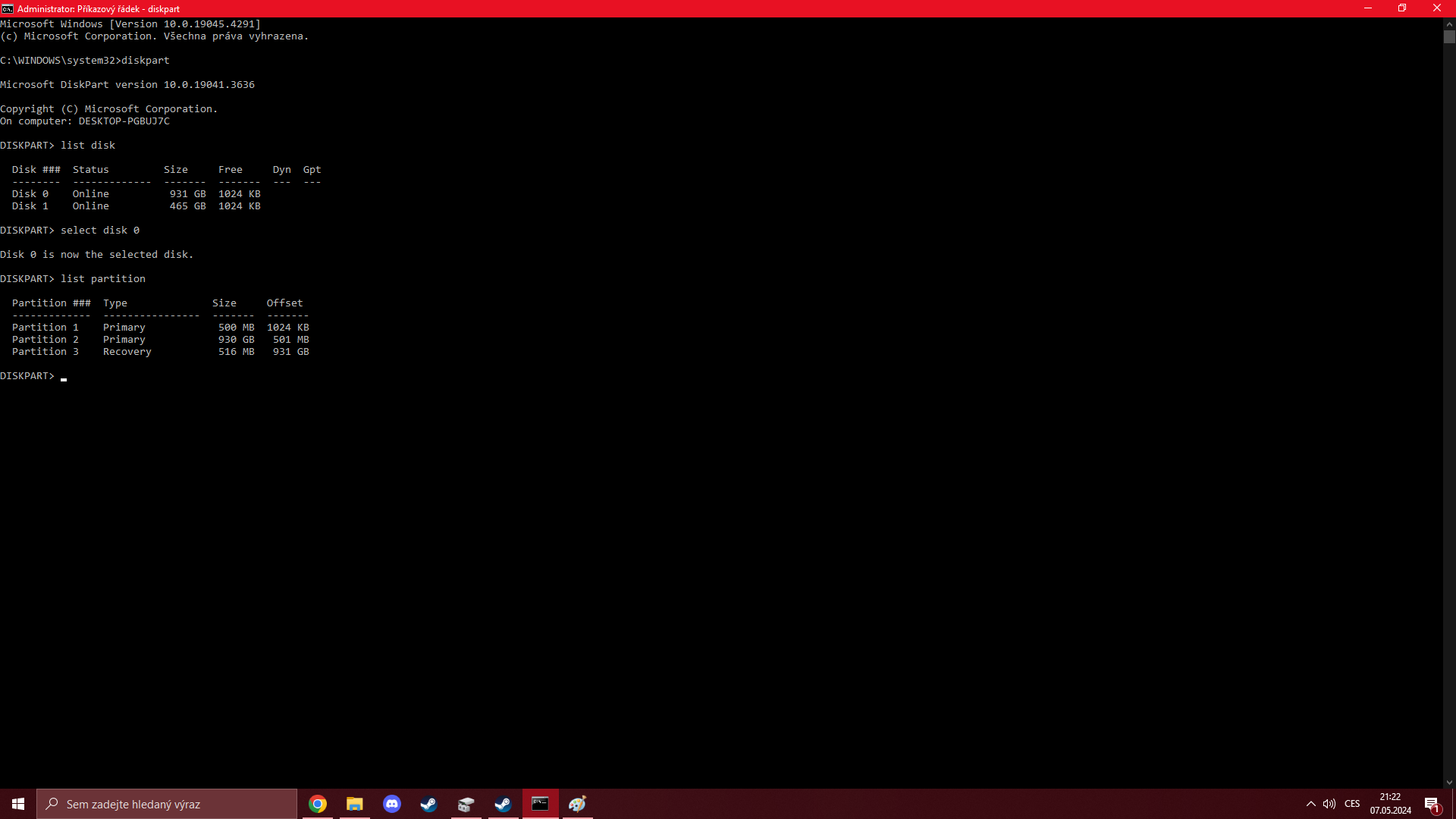 Mám tedy smazat Partition 1 zde v příkazovém řádku? Nechci nic dokur***