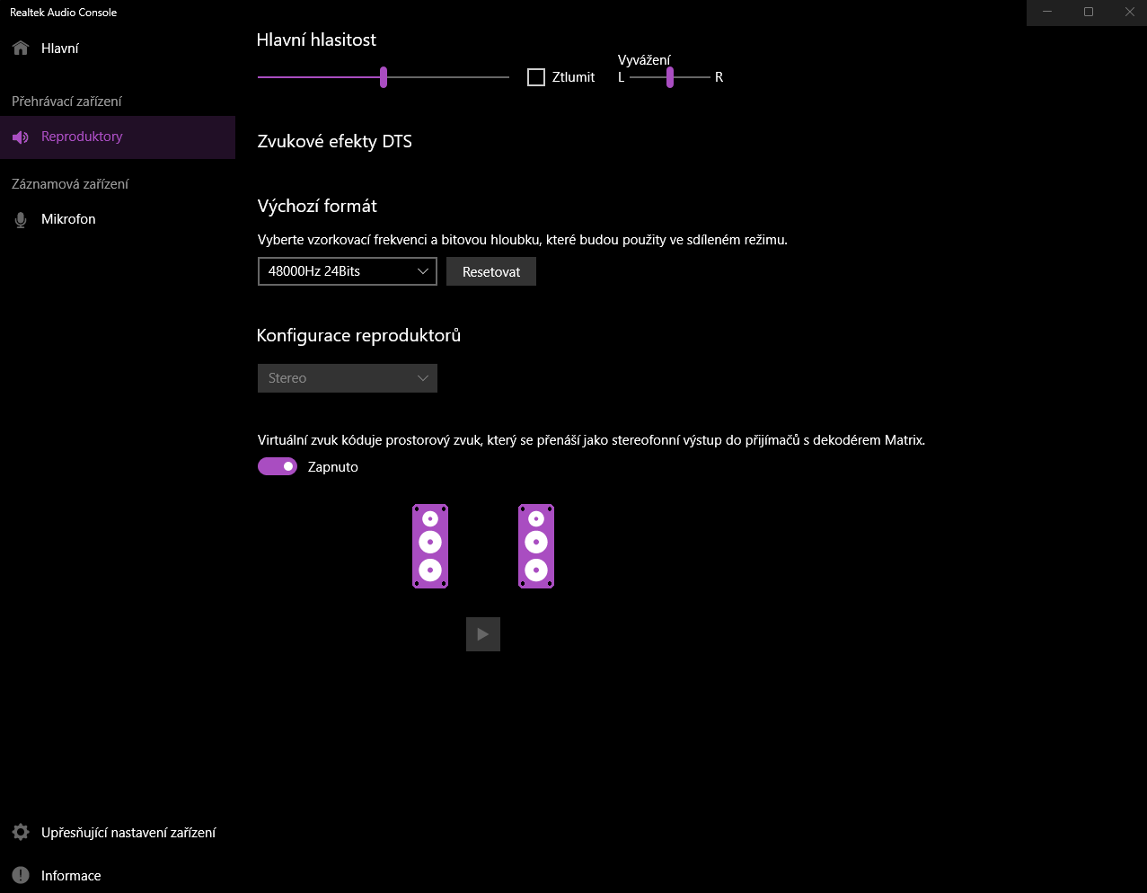 Po reinstalaci se v počítači sama objevila aplikace Realtek Audio Console, ve které jsem pochopil, že se něco málo přenastavit asi dá, ale i okem laika bych řekl, že toho moc není. Přikládám také screenshot.