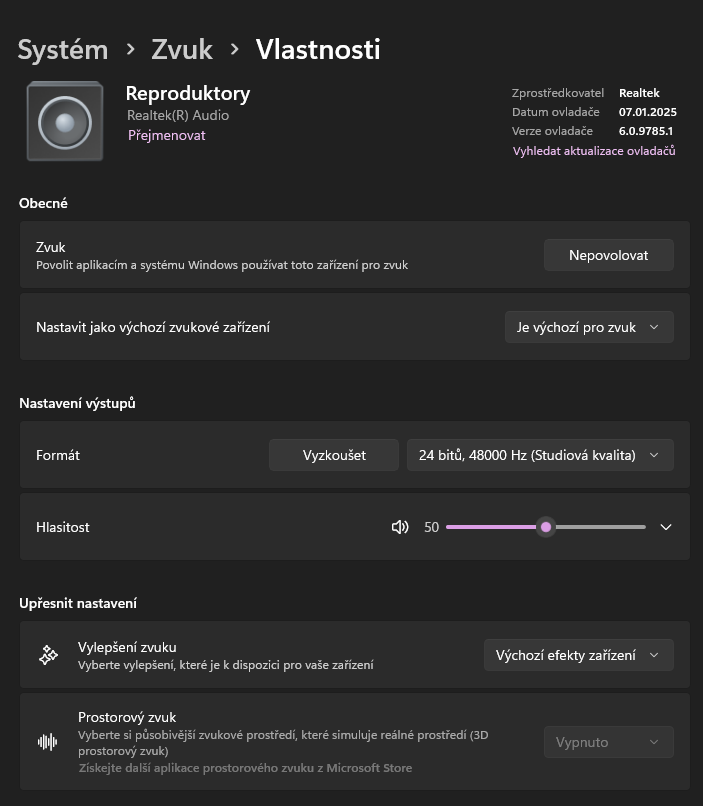 EDIT.Výrazem suchý označují zvukaři zvuk bez dozvuku (prostoru, hallu). Neměl jsi před reinstalací W 11 zapnutý Prostorový zvuk v nastavení zvuku - klik na ikonu repro vpravo dole > klik vpravo od posuvného regulátoru hlasitosti > dál viz obrázek?Zvuk mi přijde takový ''suchý'',
