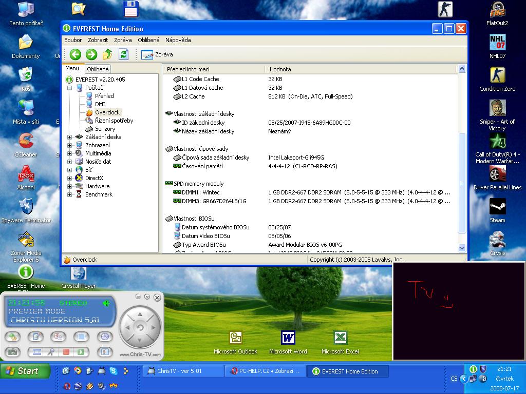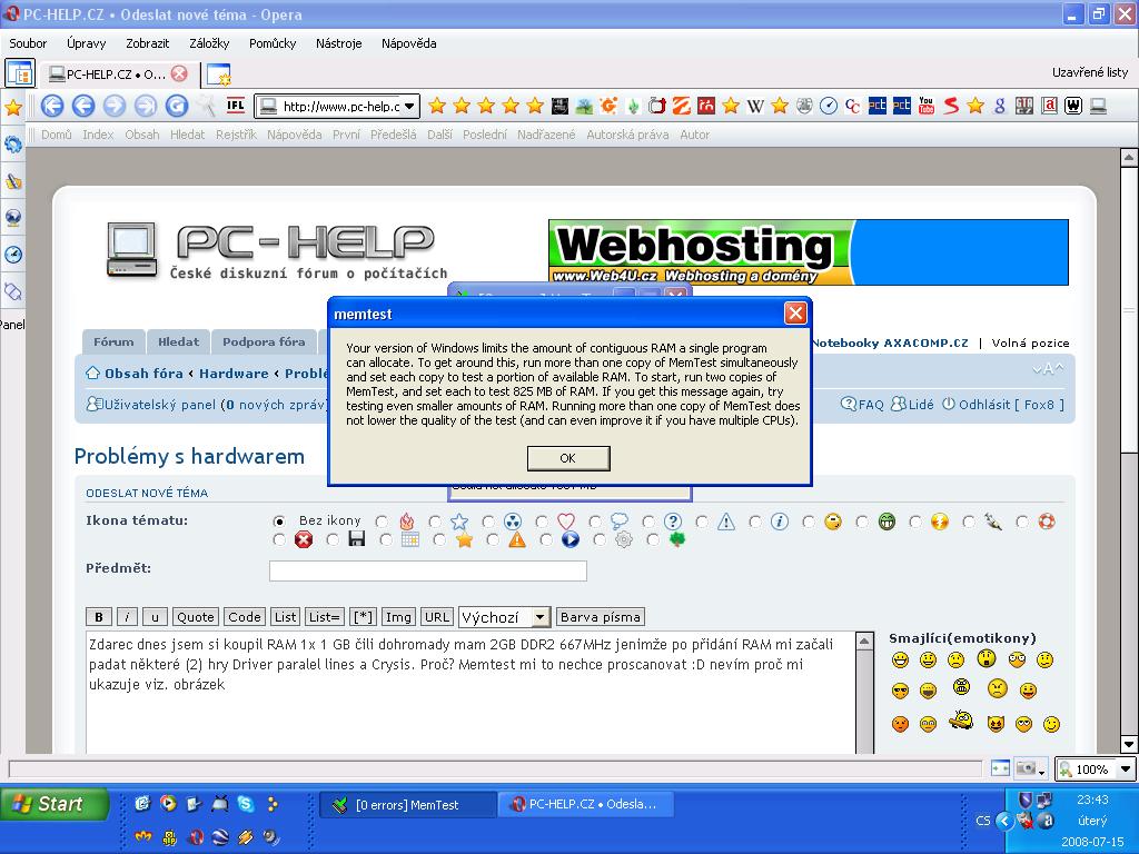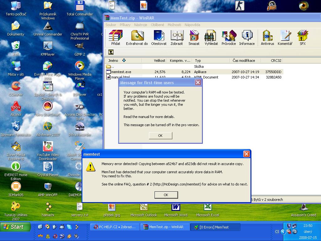 Marfy píše:Nemůže za chodu Windows otestovat celou operační paměť.Po spuštění Memtestu navol v okýnku velikost jen 1GB.Navíc tvoje deska oficiálně nepodporuje 667Mhz paměti.Zkus je přes BIOS snížit na 533Mhz.