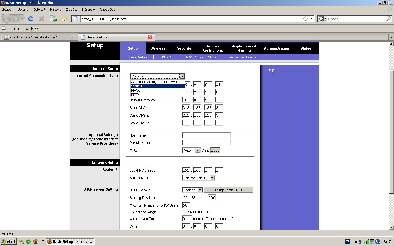 Tak před chvílí mi dovezla DPD novou WiFinku. Je to Linksys, ale problém je ten, že ikdyž jedu podle suprového manuálu, tak na konci to zařve a internet nejde, ani stolním, ani na notebooku. Poraďte mi prosím, jak krok po kroku mám postupovat. Poskytovatel mi psal, že další IP adresy mám zdarma a problém tedy z jeho strany nebude...
