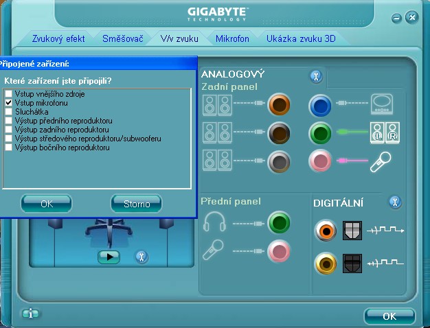 Mikrofon se připojuje do růžové zdířky vzadu na bedně a potvrdí v tom malém okně (viz příspěvek od cicera). Pokud máš připojen vstup mikrofonu v předu na bedně do základní desky, můžeš mikrofon připojit tam, ale opět potvrdit v tom menším panelu. Otestuj to pak v Ovládací panely - Zvuky a zvuková zařízení - záložka Hlas a na ni dole Test zařízení. Testuje to mikrofon a jeho nahrávání a tak poznáš zda je to funkční.