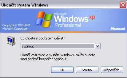V práci máme rachotinu s asi Win 2000 a ty když vypínám, tak na obrazovce vlevo dole Start-Vypnout počítač-pak si to chvílu chroustá a pak vykoukne ta hláška-Nyní můžete počítač bezpečně vypnout. Pak zmáčknu čudl na bedně a je tma