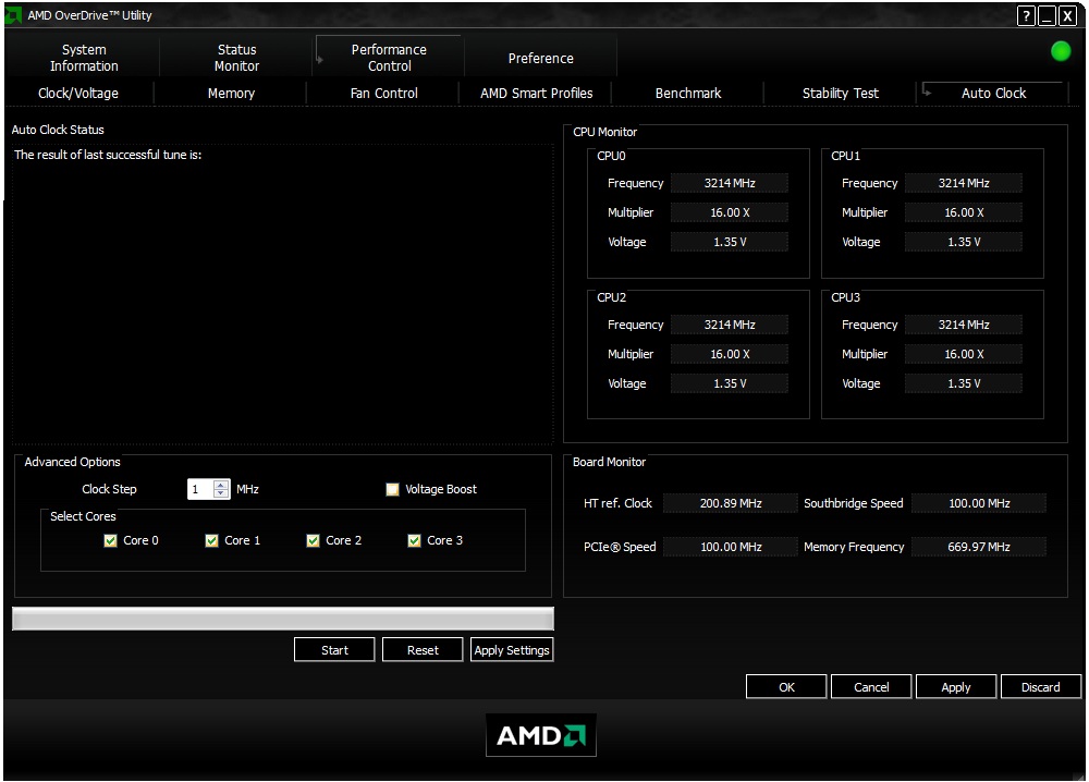Dnes jsem dělal hodinový zátěžový test v AMD Overdrive (vše OK), během toho jsem byl na netu i koukal na FullHD videa, takže je vše OK. Poté jsem si procházel v Overdrive a v sekci (viz screen) stistkl tlačítko Start. Co to vůbec dělá? Nevím chtěl jsem to zkusit, ale vyskočila modrá obrazovka (omlouvám se nevím co psala a nemám ji) a systém udělal bác. A už nenajel. Mrzl při logu Spouštění Windows. Po nějaké době vypínání a zapínání - přirozeně jsem dal v Biosu "Load defaults" už nebyla ani tendence ten BIOS vůbec zapnout.