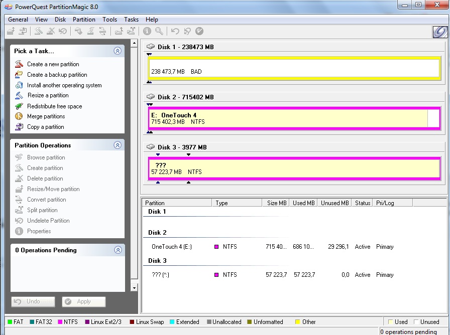 No a nyní je zásadní věc v tom, že disk je z 90% zaplněn daty, které potřebuji, ale nevím, jak ho obnovit nejlépe do stavu, kdy bude funkční tak, jako byl předtím, tzn. bez nutnosti jej formátovat. Příkazy fixmbr apod. nefungují, chkdsk také ne, protože oněch 4GB neobsahuje žádné systémové informace, pouze části dat, které nejsou podstatné, ale povedlo se je prostřednictvím getdatabck dostat ven, ale jak píši, pouze 4GB, přičemž originální velikost je 60GB, BIOS disk vidí jako klasickou 60tku. Nevím kde je problém, Parititon Magic ukáže, že není naformátovaný a nic dál, dokáže mi prosím někdo pomoci ?