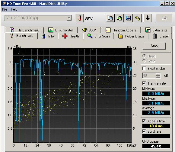 Ahoj poslední dobou mám extrémně pomalý počítač. Mám podezření že je to harddiskem. Otestoval jsem ho HD Tunem a podle mě hrůza. Počítač je to: Intel Celeron 1.7GHz, 512 Ram, Nvidia GeForce 4 MX 440SE with AGP8X, Win XP. Neočekávám od toho zázraky, stačí mi když na tom bude v pohodě šlapat internet, filmy, word atd. Ale tohle je fakt strašný. Jinak HDD beží v režimu DMA. Když jsem dal otestovat zdraví HDD, tak tam vyskočilo nějake varování. Můžete mi prosím poradit co s tím?