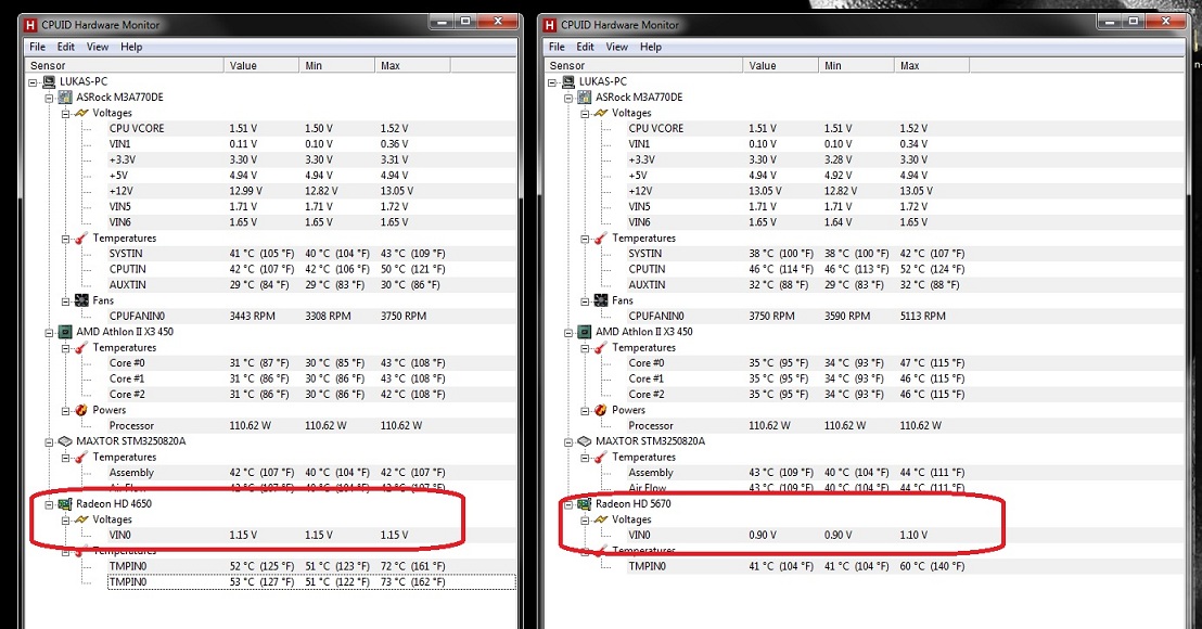 Zdravím, mám problém s PC. V některých situacích mi zamrzá PC (myslím ze při změnách zatížení Grafické karty). Pro upřesnění: PC padá na konci loadingu her (né vždy), problém se vyskytuje hlavně u RPG her (dungeon siege 2 -padalo pořád, dragon age nakonci loadingu, dále PC padá při minimalizaci a maximalizaci her). 3D mark běžel 8h, future mark 72hodin a neobjevil sem žádný problém, také testy procesoru a paměti proběhli v pořádku. Grafiku jsme zkoušel reklamovat ale neuspěšně. Myslím že na grafice je nestabilní napětí, testoval sme i jinou ale tam bylo pevné, ale méně náročnou grafiku na zdroj (HD4650). Přikládám screen těch napětí. Nakonec přidávám svou sestavu: AMD Athlon II x3 450 (3,2Ghz), 4Gb RAM Zeppelin 1600Mhz, Graf. karta ATI radeon HD5670. Zdroj LC500H-12 v2.2 500W.