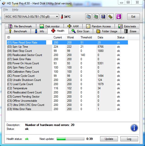 Típni a hoď sem obrázek z HD Tune Pro 4.60, záložka zdraví / Health uvedeného disku.