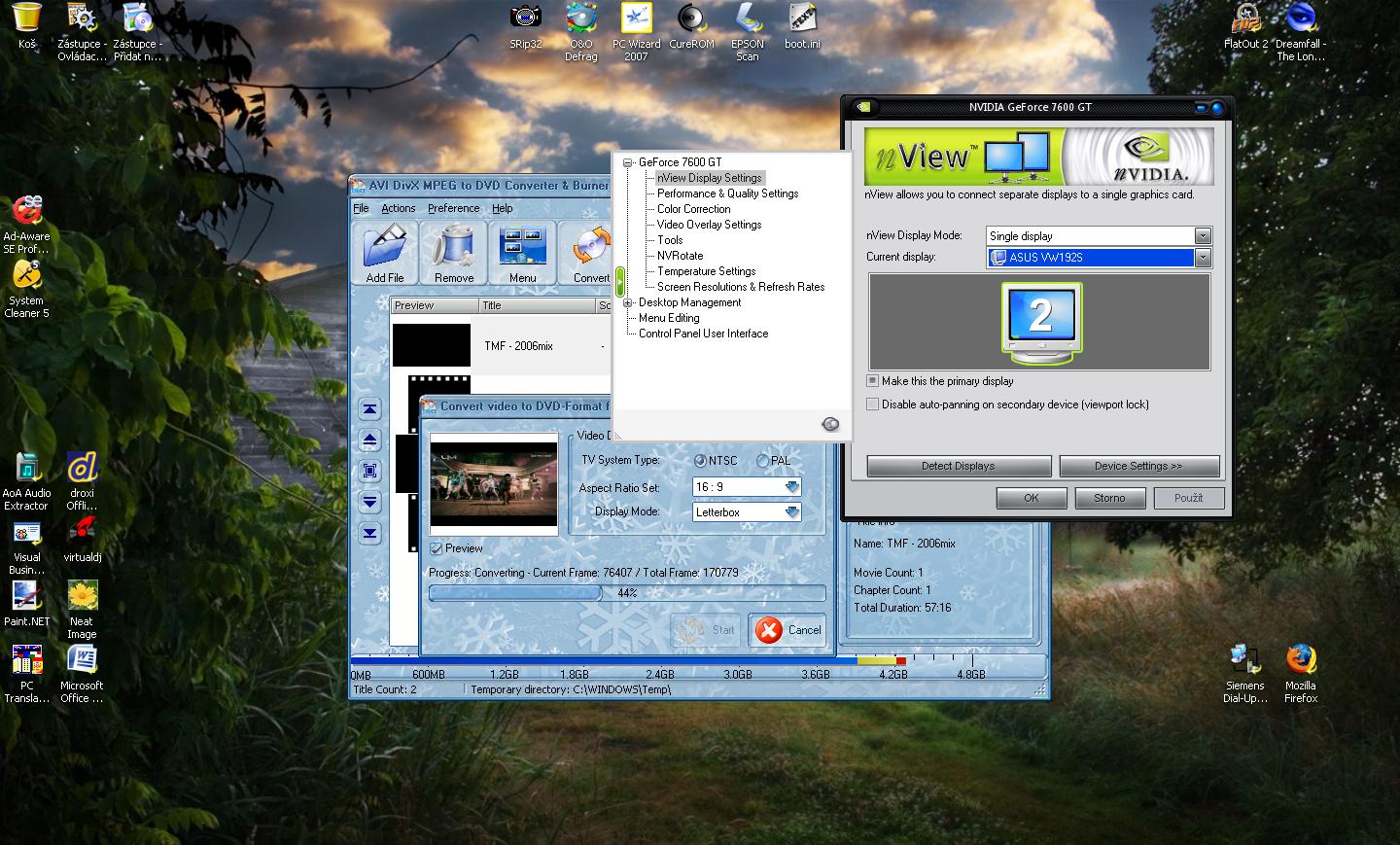 Zdar prosím potřebuju radu. Mám grafárnu ATI Radeon 9800PRO a chtěl jsem jí zapojit do Tv Panasonic TX-29PS11P, použil jsem S-Video kabel a nic, vůbec se nechytá, prostě černo. Matně si vzpomínám, že tak před třema rokama jsem to zapojení měl, ale pak došlo ke stěhování a já jsem měl PC v jiné místnosti. Teď mám TV u PC a chci to zapojit a nic. Zkoušel jsem i jiné kabely a nic. TV S-video funguje, normálně přes to pouštím videokameru. Dá se nějak zjistit, jestli je můj Svideo výstup na grafárně OK? Díky za info Butes