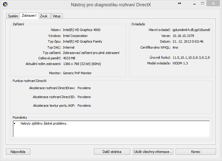 Můžu vám tady přiložit obrázek z Nástroje pro diagnostiku DirectX, kde mám seznam grafických karet, jenomže se mi tam zobrazuje pouze Intel, přijde mi to, že ji mám vypnutou, ale to je asi blbost.
