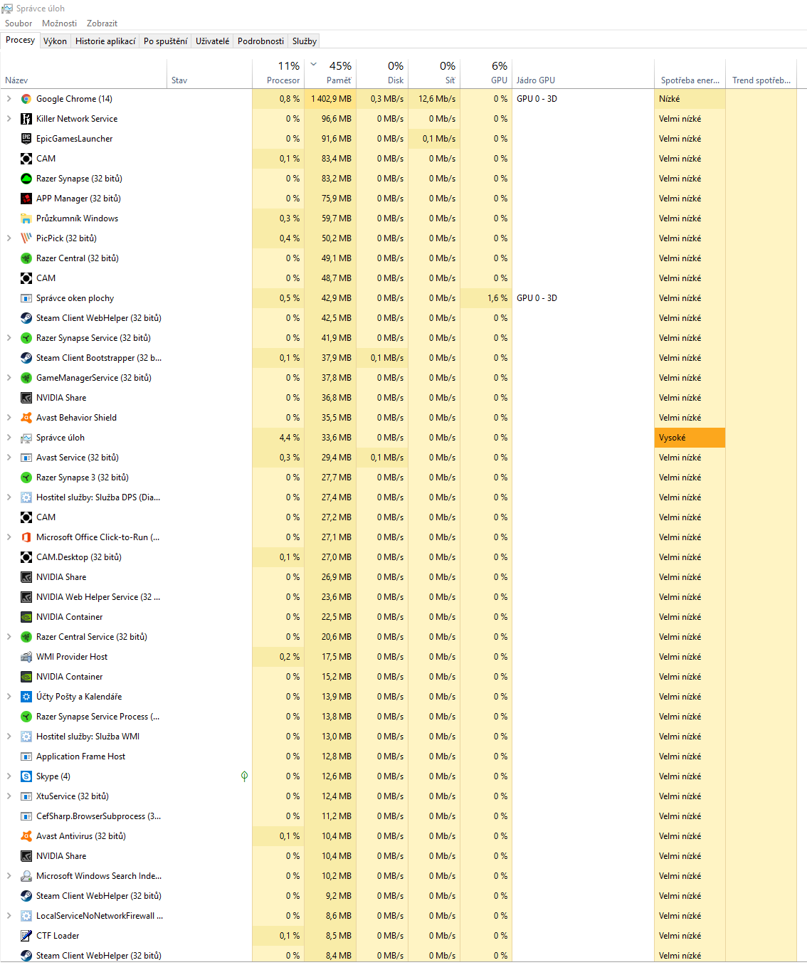 PC teď bere 7,5 GB RAM. Mám otevřený Chrome, 4 záložky a ve správci úloh bere nejvíce Chrome a to 1,5 GB RAM. Potom už např. Killer, Cam, Razer sotva 250 MB.
