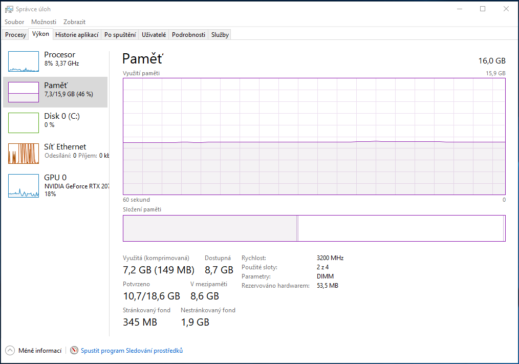 Minule jsem měl i7-8700K, taky 16 GB RAM a Windows 10. Vím, že mi po spuštění bral v poho max. 4 GB RAM.