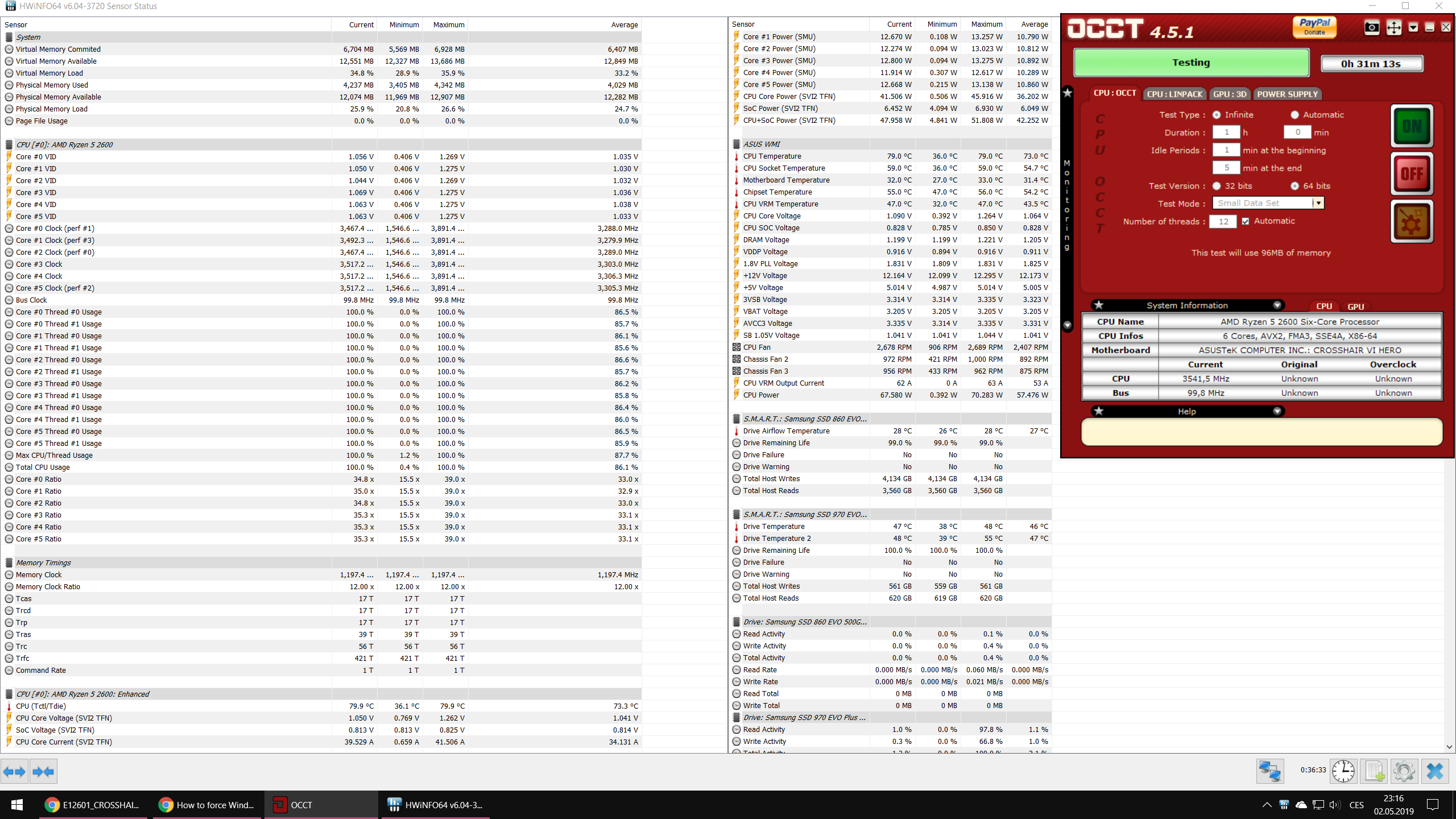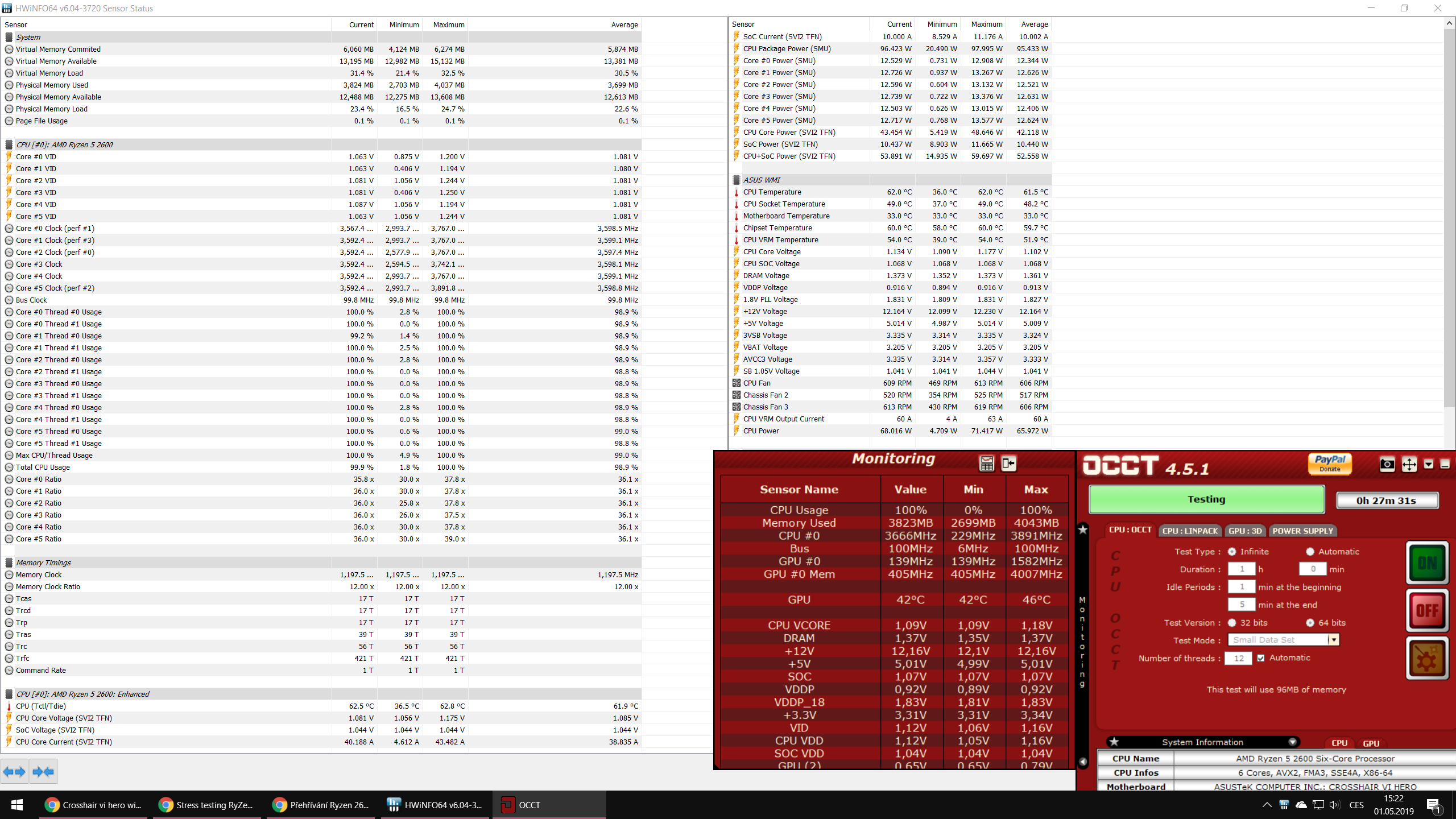 V Idle jsou teploty o pár stupňů nad Ninjou (tzn. 40 °C). Při zátěží v OCCT small data (bez jakéhokoliv OC a úprav v BIOSu) se teploty vyšplhali až na 80 °C při stabilních taktech 3,45 - 3,5 GHz pro všechna jádra. S Ninjou při stabilní frekvenci 3,6 GHz to bylo 62 °C a všechny ventilátory běžely na cca 75 % maximální rychlosti (v minulém příspěvku jsem udával 65 °C a větráky na plno, ale jak jsem zjistil ze screenshotu, tak tam bylo mírně (manuálně) zvýšené VCore)