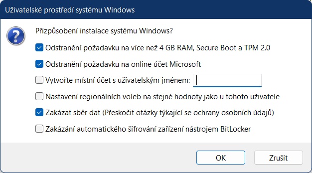 Zaškrtl jsem Odstranění požadavku na více než 4 GB RAM, Secure Boot a TPM 2.0 / Odstranění požadavku na online účet Microsoft / Zakázat sběr dat.