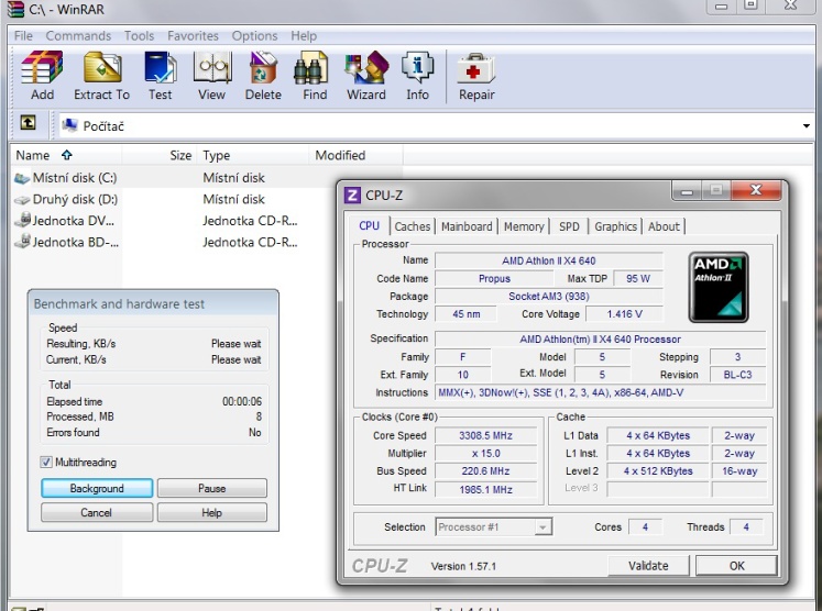 Jakmile hru ukončíš,tak frekvence CPU hned "sletí" dolů. Stáhni si program WinRAR (pokud ho ještě nemáš) a po jeho spuštění dej Nástroje -Provést test výkonu počítače.Popřípadě pokud bude anglicky,tak zvol Tools -Benchmark and hardware test.Ještě předtím si spusť CPU-Z.Tak jako je to v obrázku níže.Při zapnutí testu je jasně vidět že je plná frekvence (u mne 3,3Ghz) a když ten test ukončíš tak uvidíš hodnotu cca.800Mhz.