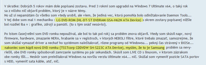 @X ... ono to urobi stale, uplne stale ked vlozim do mechaniky DVD / CD. Po 5-15 sekundach proste postupne zamrzne Windows a nic sa neda robit, restartnut to viem normalne tlacitkom na restart. Som si skoro isty ze to musi byt softwarovi problem alebo hardwarovi, ktory sa da jednoducho odstranit , kvoli tomu ze to na tom linuxe proste bezalo normalne. Len s windowsom ma problemy.