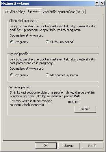 -32 bitový Windows neumí adresovat více jak 4GB v případě, že není zapnutý režim mapování paměti PAE. A nepomůže ani 120GB stránkovací soubor. Jelikož systém používá i v jádře virtuální adresy, je zde to omezení vyplívající z malé velikosti položek stránkovacích tabulek a adresářů. Tedy měl pravdu petr22 v jednom svém příspěvku, že pokud do takového systému nacpeš grafický adaptér s 2GB videopaměti (kterou je nutno namapovat do virtuální paměti, aby se s ní dalo pracovat), připravíš se o 2GB z operační paměti, které pak nelze adresovat.